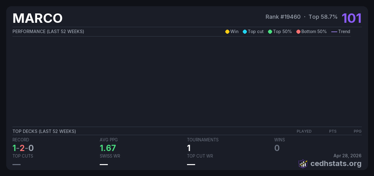| CEDHHH Aug 07, 2025 · 20 players | Invalid pairing | 8/20 | 1-2-0 | 1.67 | 101 |