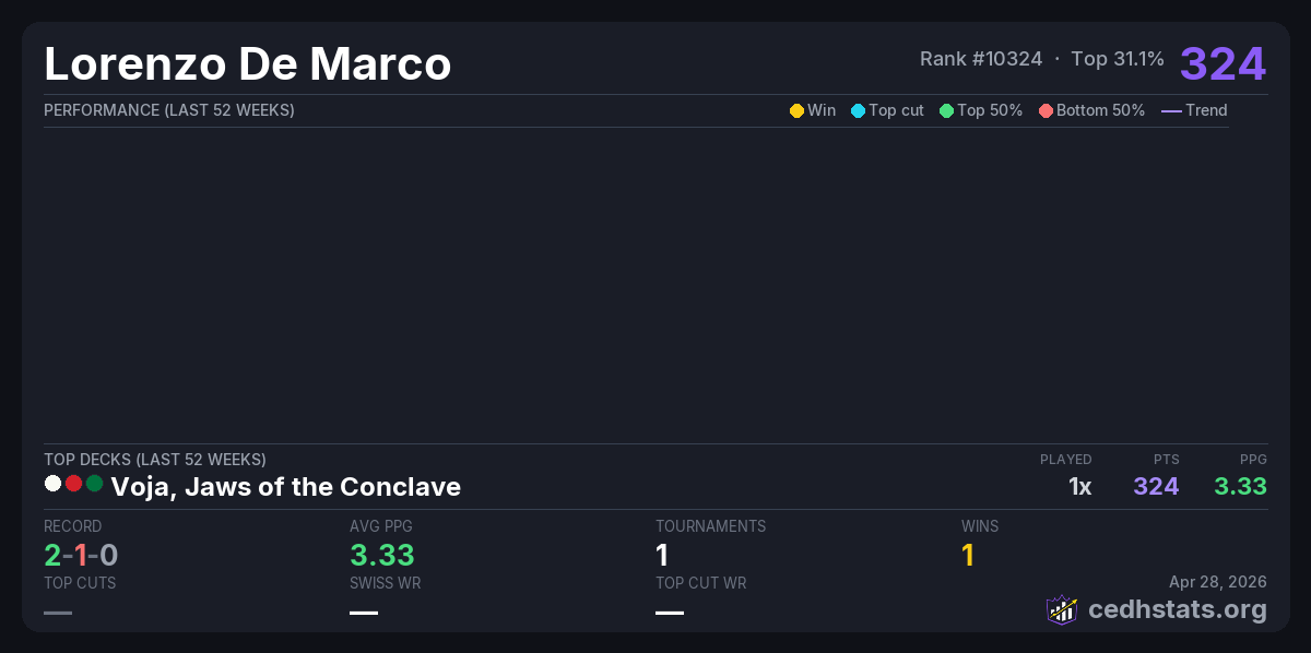 | Lega Commander - Bracket 3 - Tappa 2 Apr 26, 2026 | Voja, Jaws of the Conclave | 1/23 | 2-1-0 | 324 |