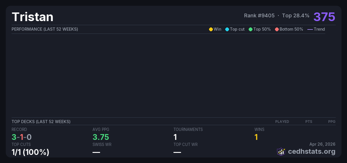 | Storm Champs July Jul 26, 2025 | Invalid pairing | 1/16 | 3-1-0 | 375 |