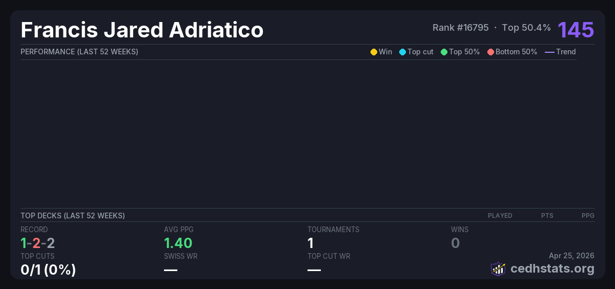 | MTG x Final Fantasy Commander Party Jun 21, 2025 · 31 players | Invalid pairing | 10/31 | 1-2-2 | 1.40 | 145 |