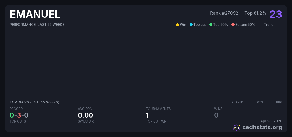 | CEDHH Aug 28, 2025 · 20 players | Invalid pairing | 15/20 | 0-3-0 | 0.00 | 23 |