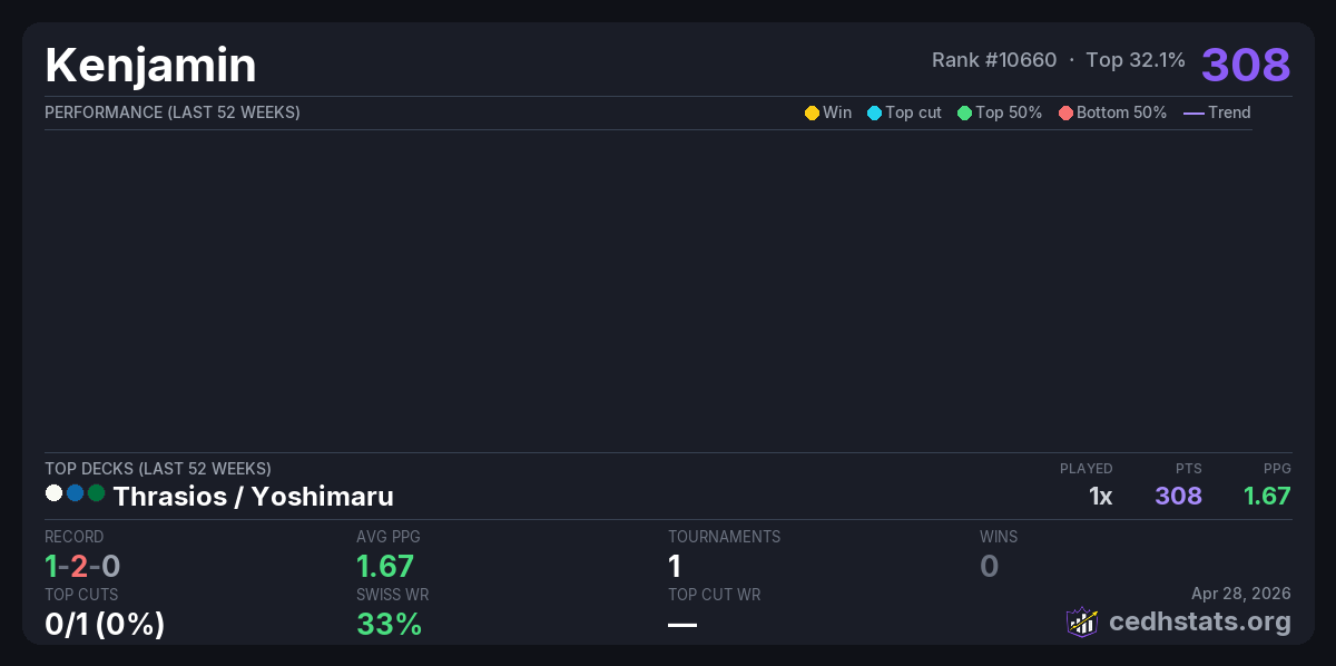 | AZMS CEDH League Qualifier #3 Apr 25, 2026 | Thrasios / Yoshimaru | 7/21 | 1-2-0 | 308 |