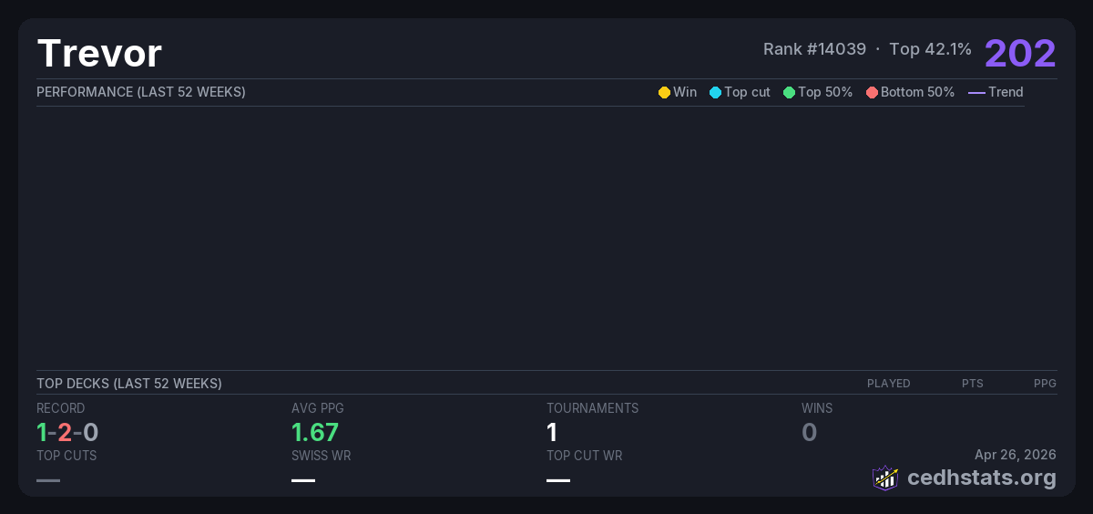 | Commander Precon League 2 Week 5 Sep 13, 2025 | Invalid pairing | 4/24 | 1-2-0 | 202 |