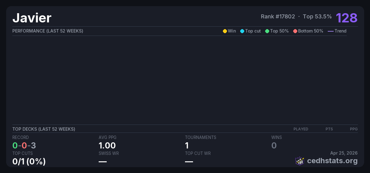 | Mid Commander 28/11 Nov 28, 2025 · 20 players | Invalid pairing | 6/20 | 0-0-3 | 1.00 | 128 |