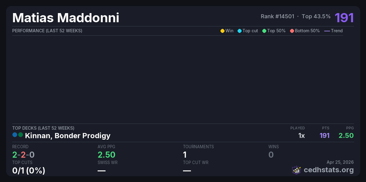 | Torneo Clasificatorio al HoF en el Ojo Apr 26, 2025 · 33 players | Kinnan, Bonder Prodigy | 8/33 | 2-2-0 | 2.50 | 191 |