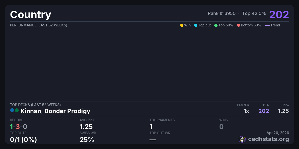 | Turf Wars: 1 - cEDH Apr 25, 2026 | Kinnan, Bonder Prodigy | 11/27 | 1-3-0 | 202 |
