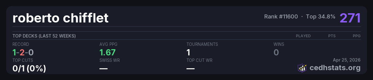 | Torneo Clasificatorio al HoF en el Ojo Apr 26, 2025 · 33 players | Invalid pairing | 14/33 | 1-2-0 | 1.67 | 271 |