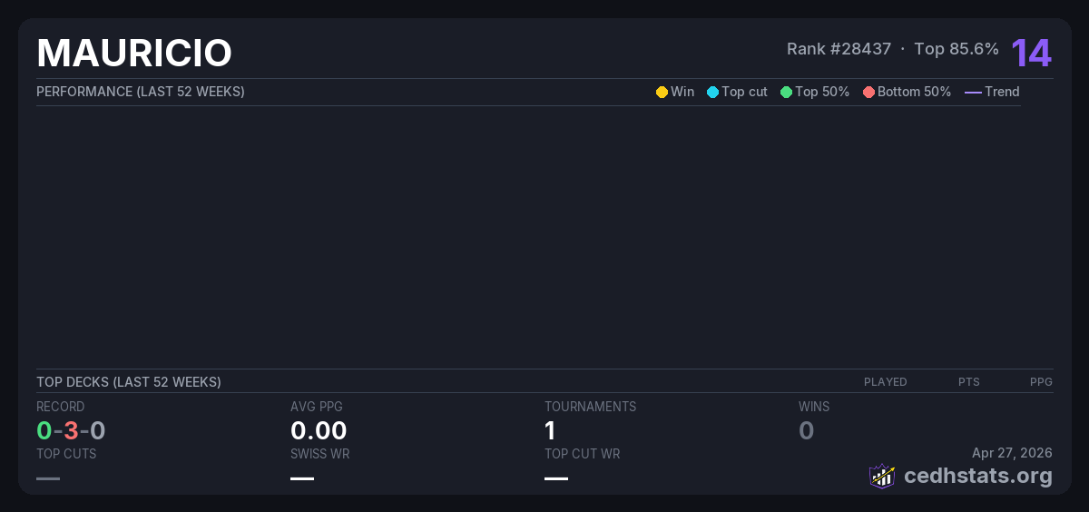 | PARA Jul 15, 2025 · 16 players | Invalid pairing | 13/16 | 0-3-0 | 0.00 | 14 |