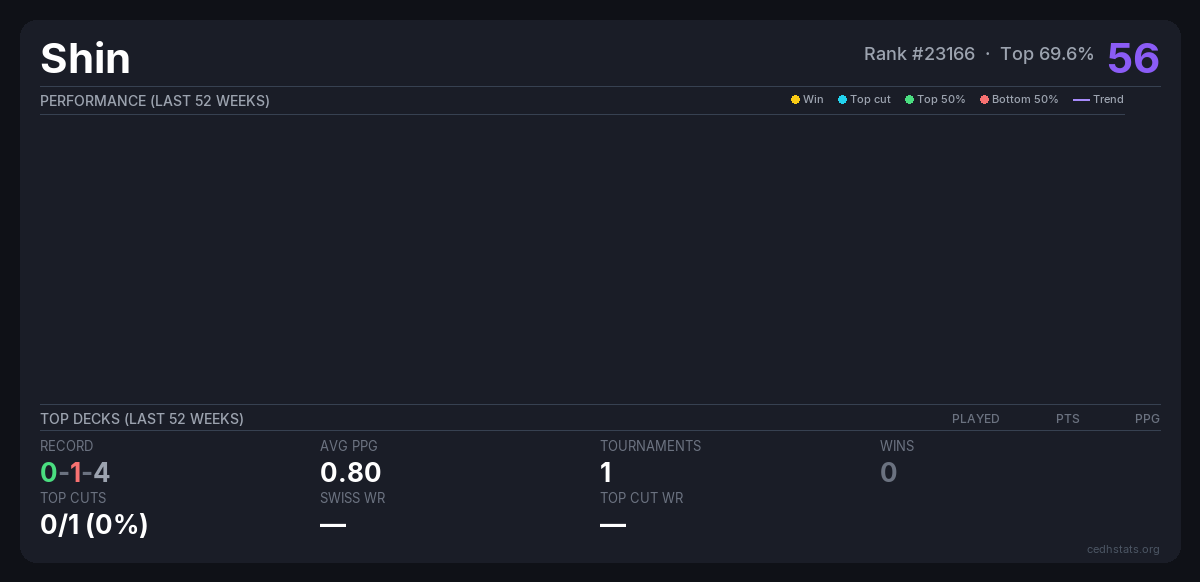 | Command Fest Shanghai 250524 May 24, 2025 · 93 players | Invalid pairing | 59/93 | 0-1-4 | 0.80 | 56 |