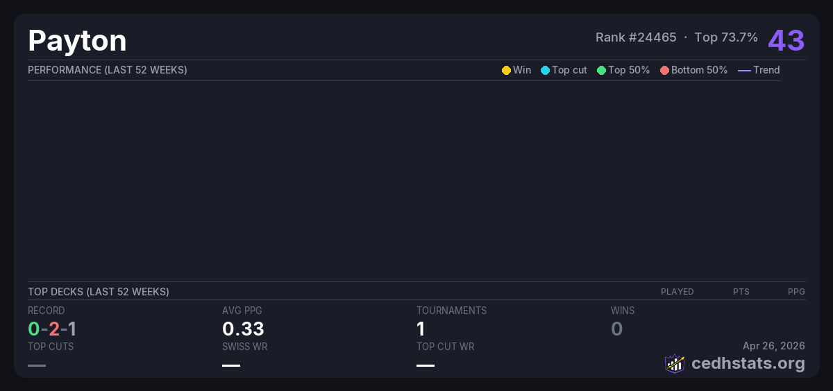 | Commander League 10 Jun 28, 2025 | — | 10/16 | 0-2-1 | 43 |