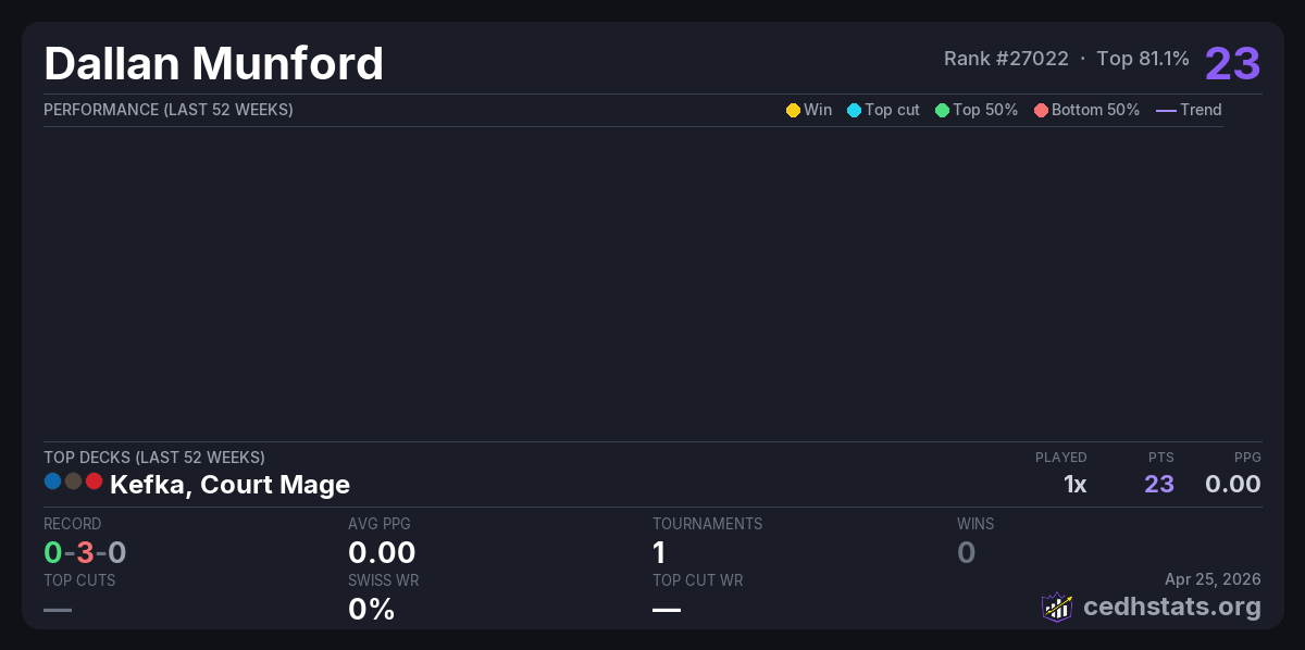 | Oasis Games cEDH Circuit (REAL ONE) 4-23-26 Apr 24, 2026 | Kefka, Court Mage // Kefka, Ruler of Ruin | 17/21 | 0-3-0 | 23 |