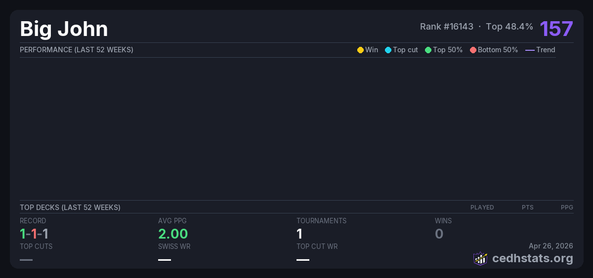 | FNM EDH 8-1-25 Aug 01, 2025 | Invalid pairing | 5/19 | 1-1-1 | 157 |