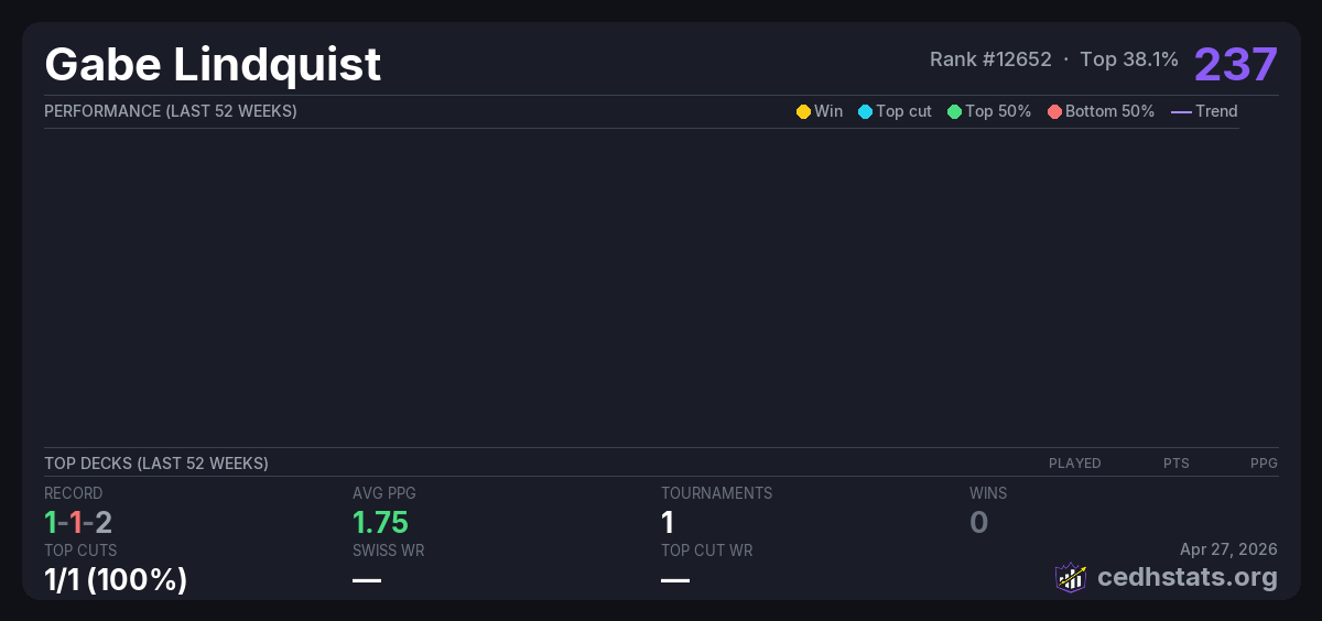 | Commander Championship May 17, 2025 | Invalid pairing | 3/20 | 1-1-2 | 237 |