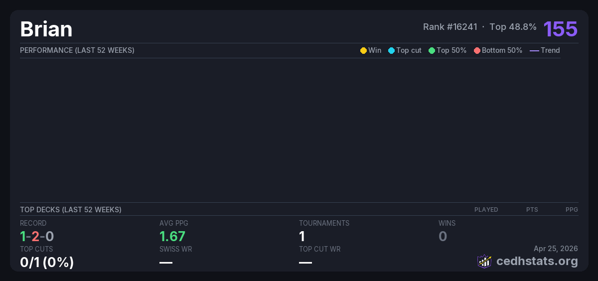 | April Qualifier Mar 16, 2026 · 20 players | 5/20 | 1-2-0 | 1.67 | 155 |