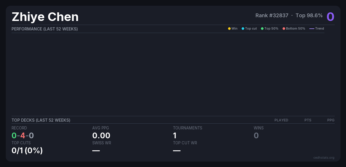 | 2025.10.25 广州CF cEDH Oct 25, 2025 · 80 players | Invalid pairing | 79/80 | 0-4-0 | 0.00 | 0 |