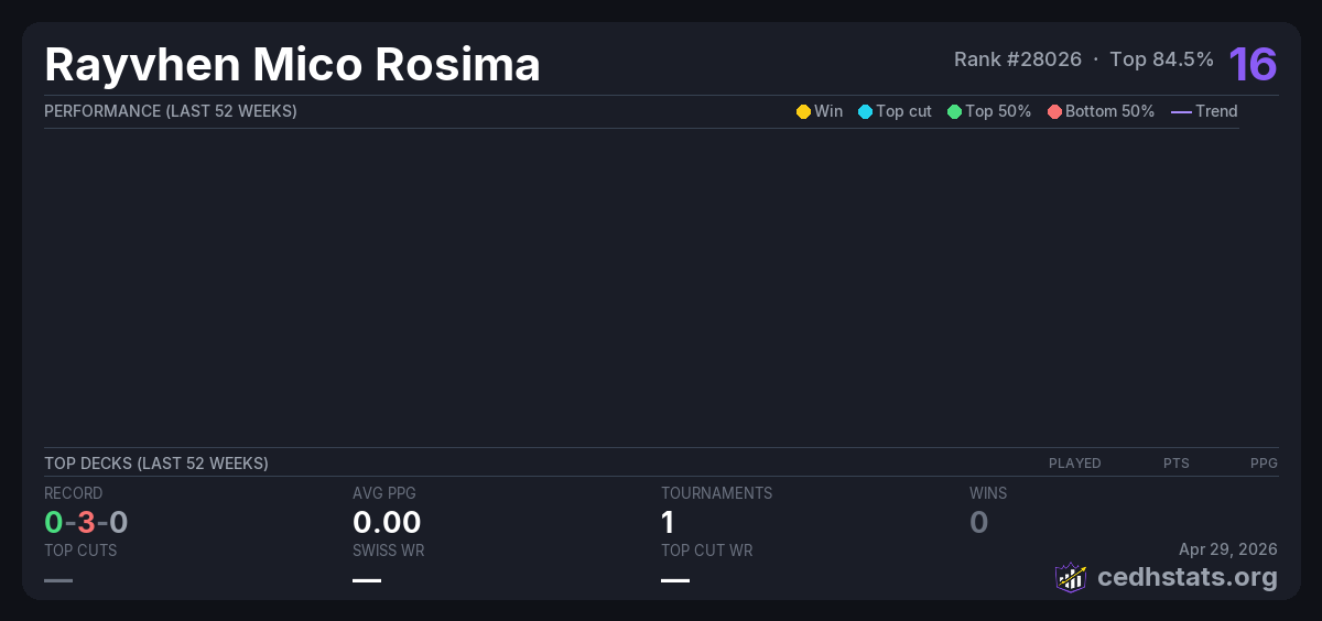 | $100 Commander Multi Jul 20, 2025 · 20 players | Invalid pairing | 16/20 | 0-3-0 | 0.00 | 16 |
