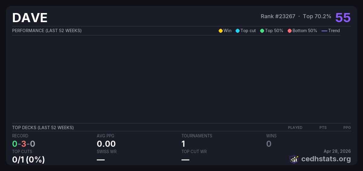 | CEDH Tournament 1 Nov 29, 2025 · 16 players | 9/16 | 0-3-0 | 0.00 | 55 |