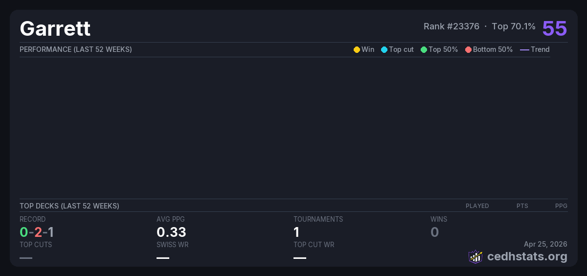 | Commander Precon League 2 Week 4 Sep 06, 2025 · 25 players | Invalid pairing | 15/25 | 0-2-1 | 0.33 | 55 |