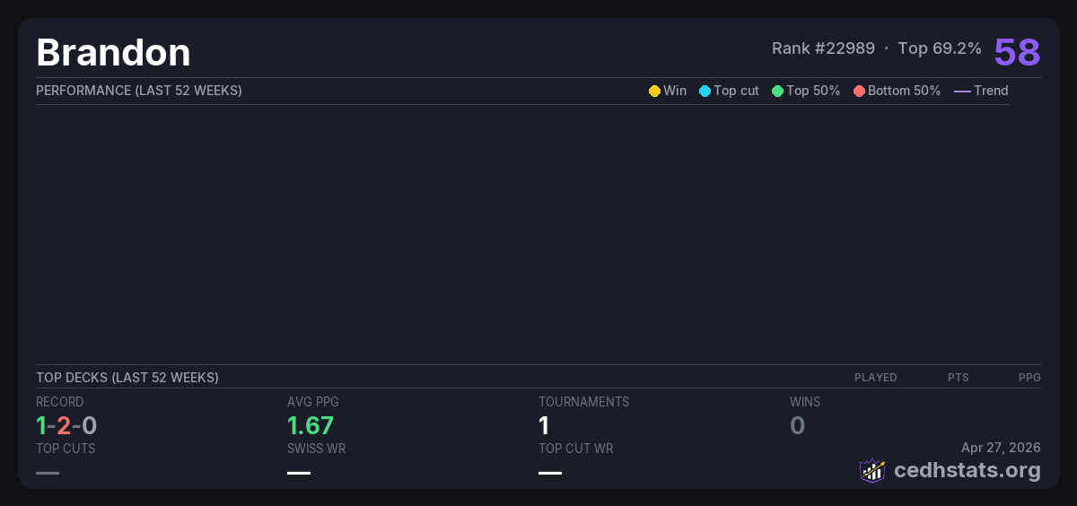 | Magic 2.0 #1 May 23, 2025 · 16 players | Invalid pairing | 9/16 | 1-2-0 | 1.67 | 58 |