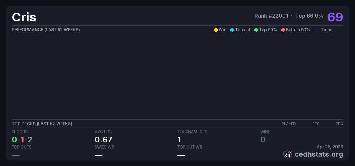 | Unaltered Precon Oct 12, 2025 · 26 players | Invalid pairing | 14/26 | 0-1-2 | 0.67 | 69 |