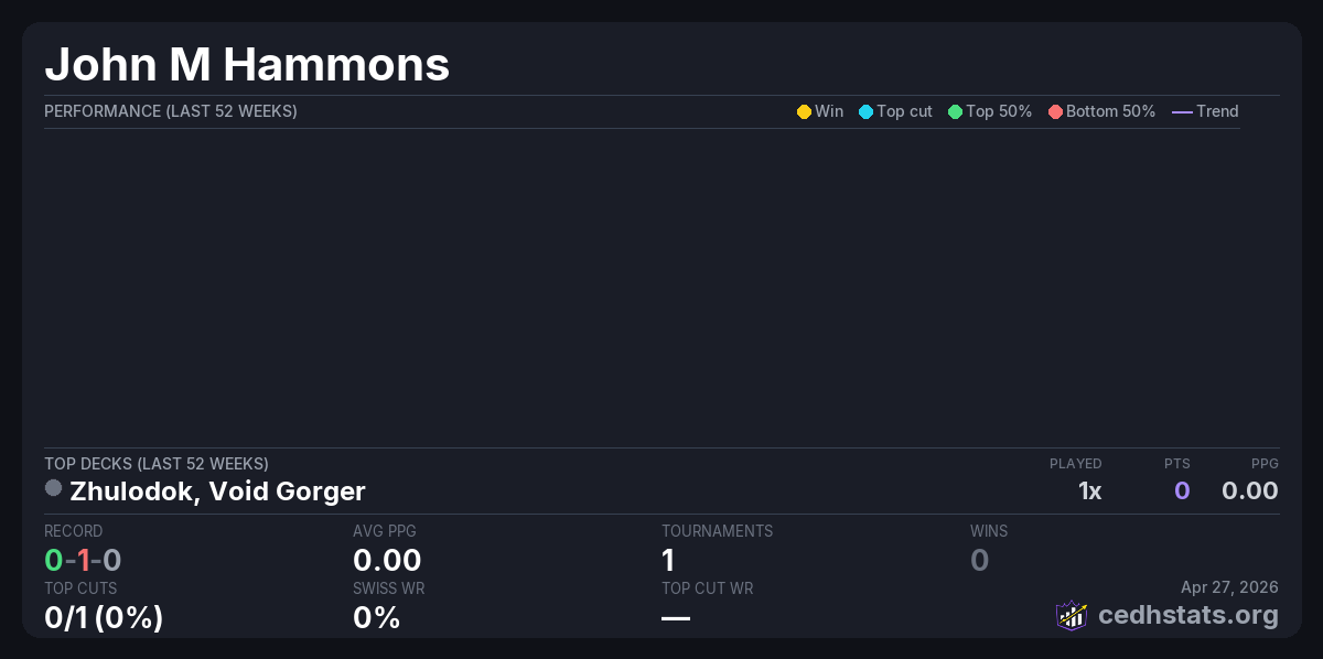 | Twisted Power - Midwest Gaming Classic TimeTwister Tournament Apr 25, 2026 · 172 players | Zhulodok, Void Gorger | 128/172 | 0-1-0 | 0.00 | — |