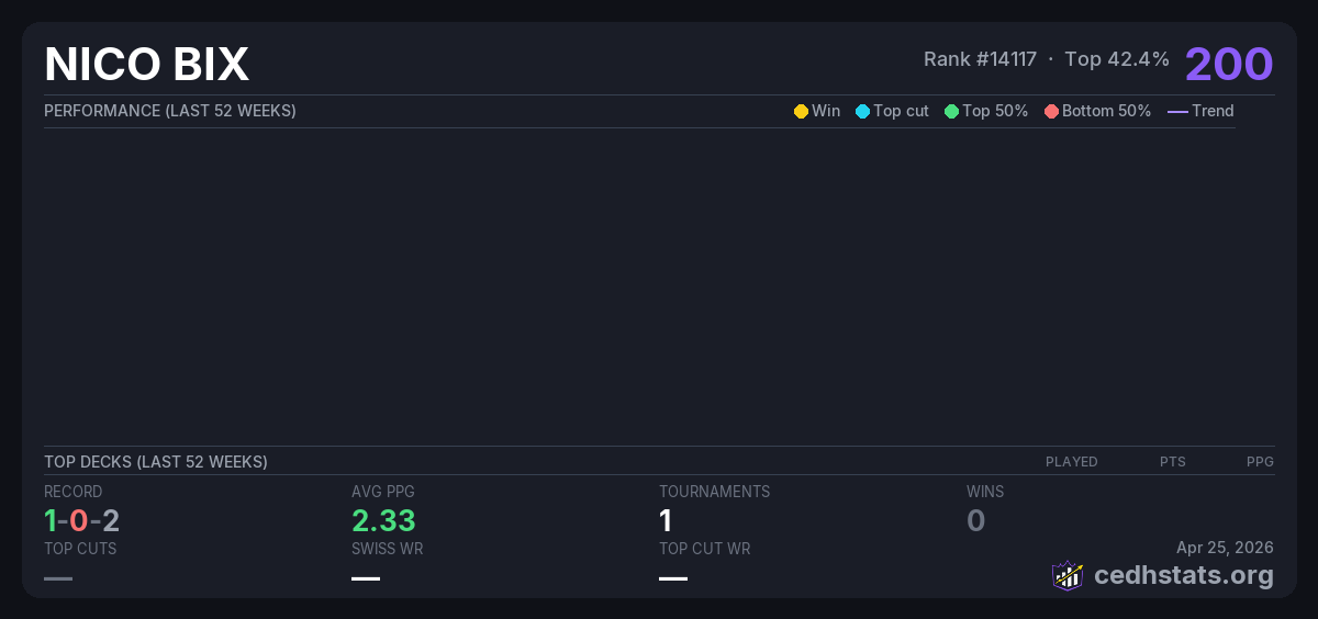 | CEDHXL Dec 04, 2025 · 24 players | 4/24 | 1-0-2 | 2.33 | 200 |