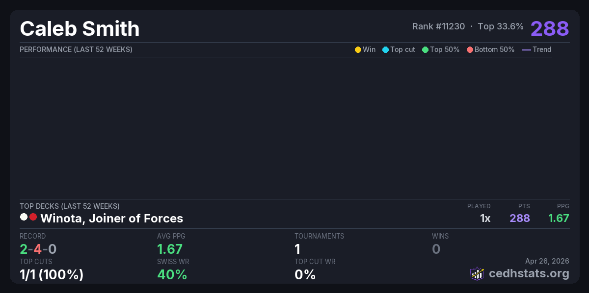 | Recycled Entertainment Dual Land CEDH Tournament Apr 25, 2026 · 35 players | Winota, Joiner of Forces | 9/35 | 2-4-0 | 1.67 | 288 |