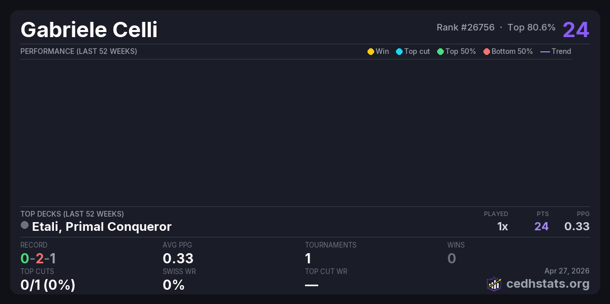 | CEDH FINSeries 25-26 #5/5 Apr 25, 2026 | Etali, Primal Conqueror | 17/21 | 0-2-1 | 24 |