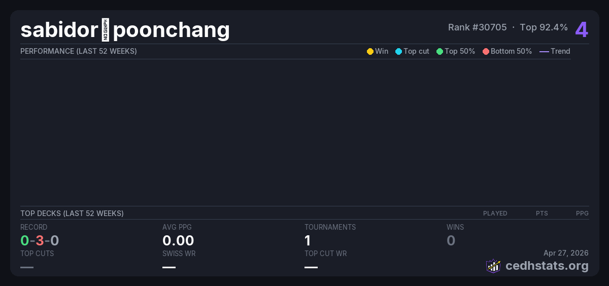 | Bracket 3 Commander Jan 18, 2026 · 16 players | — | 15/16 | 0-3-0 | 0.00 | 4 |