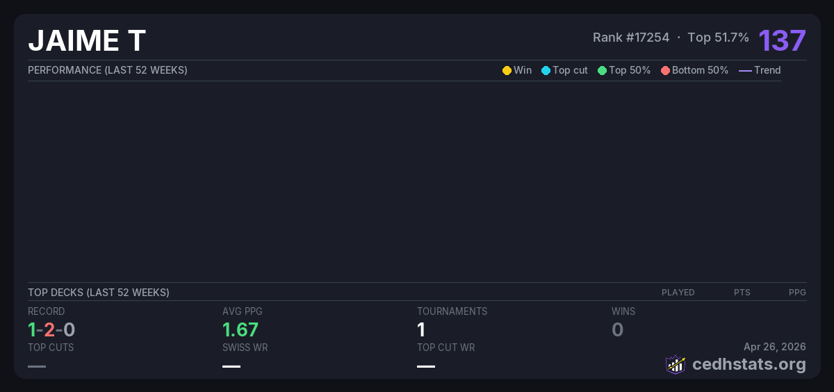 | CYDH May 29, 2025 · 20 players | Invalid pairing | 6/20 | 1-2-0 | 1.67 | 137 |