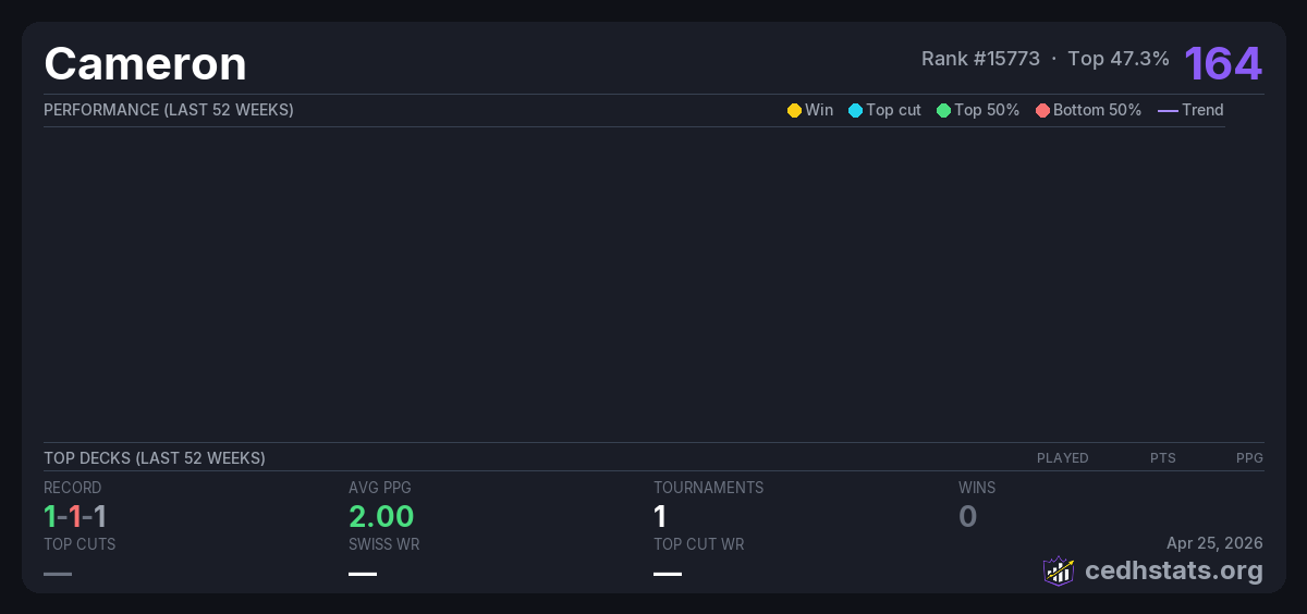 | Unaltered Precon Oct 12, 2025 · 26 players | Invalid pairing | 7/26 | 1-1-1 | 2.00 | 164 |