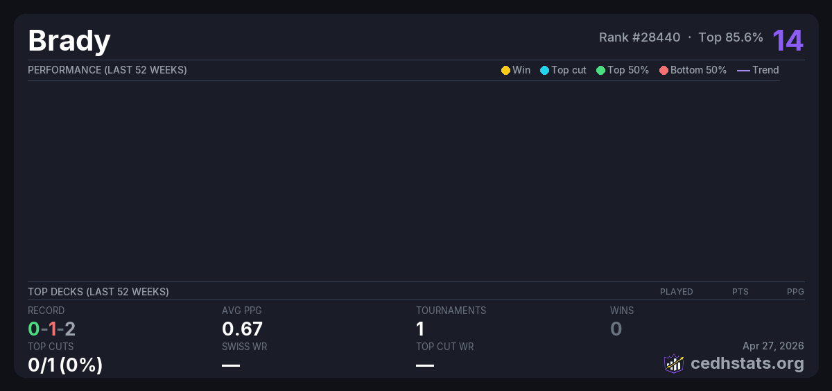| Casual Flip Commander Jan 25, 2026 · 16 players | 13/16 | 0-1-2 | 0.67 | 14 |