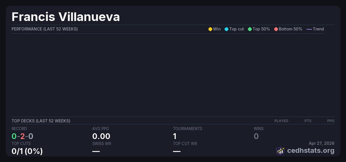 | Year End CEDH Dec 28, 2025 · 18 players | 18/18 | 0-2-0 | 0.00 | — |
