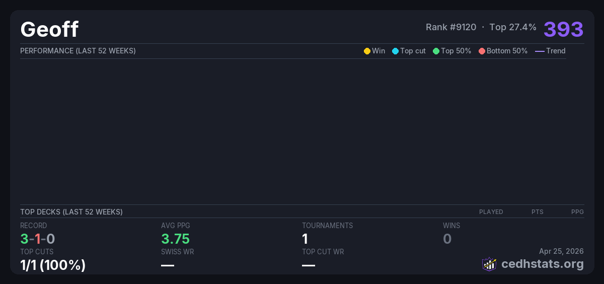 | Anti cedh Cardsurfer Games Jan 11, 2026 · 32 players | 2/32 | 3-1-0 | 3.75 | 392 |