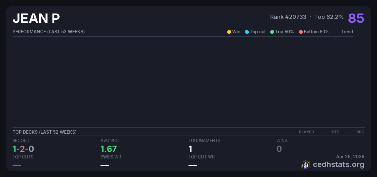 | cedh Jul 10, 2025 · 20 players | Invalid pairing | 9/20 | 1-2-0 | 1.67 | 85 |