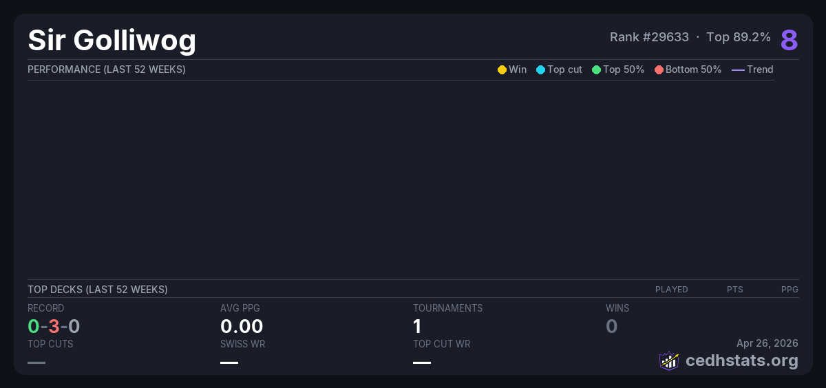 | Commander League 3 week 5 Mar 14, 2026 | 14/16 | 0-3-0 | 8 | |