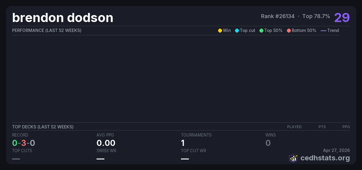 | FNM Commander @ Game On! NC Jul 18, 2025 · 32 players | Invalid pairing | 23/32 | 0-3-0 | 0.00 | 29 |