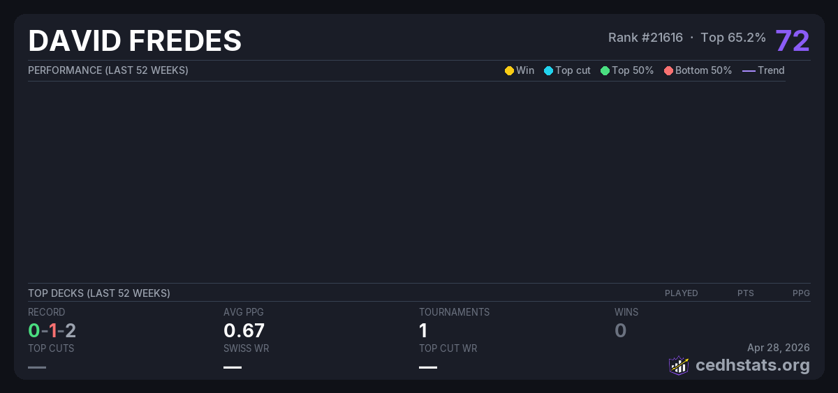 | CYDH Oct 02, 2025 · 20 players | Invalid pairing | 10/20 | 0-1-2 | 0.67 | 72 |