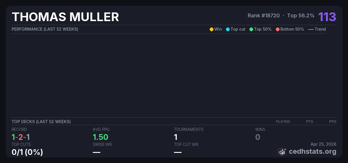 | CEDH HAMMER NOCTURNO Oct 18, 2025 | Invalid pairing | 8/22 | 1-2-1 | 113 |