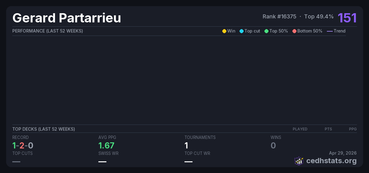 | PreCon Arise de Agosto Aug 23, 2025 · 19 players | Invalid pairing | 5/19 | 1-2-0 | 1.67 | 151 |