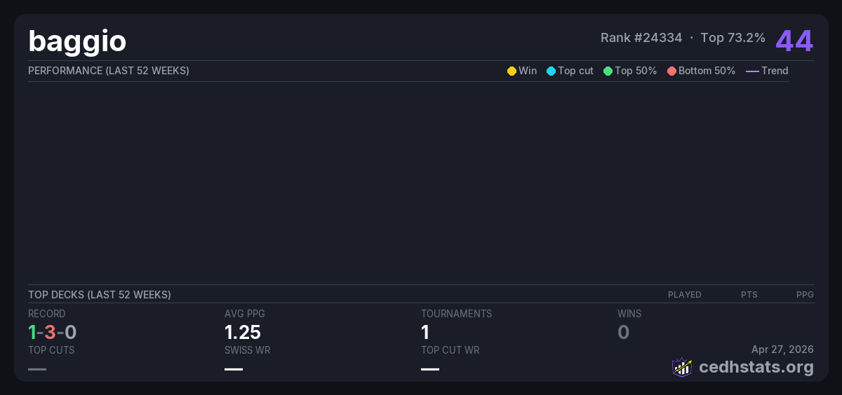 | THEONETOURNAMENTO Jan 19, 2026 · 16 players | 10/16 | 1-3-0 | 1.25 | 44 |