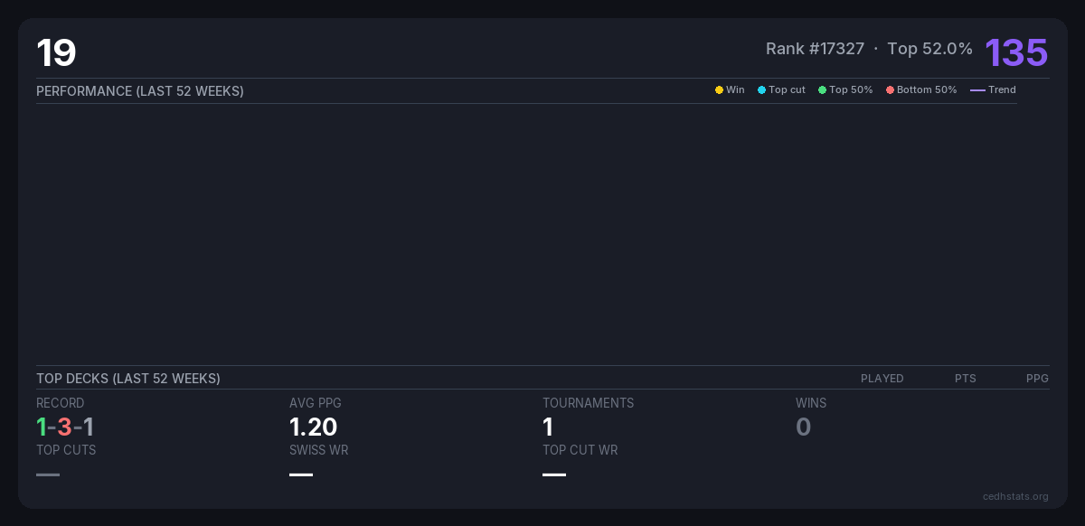 | Tournament | Deck | Result | Record | PPG | Points ? |