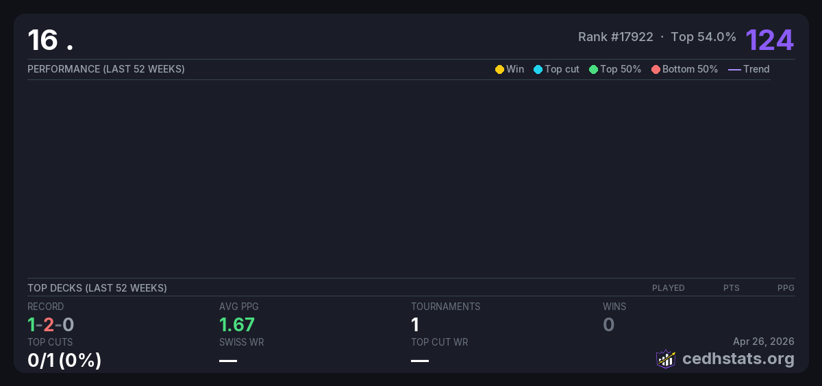 | Tournament | Deck | Result | Record | PPG | Points ? |