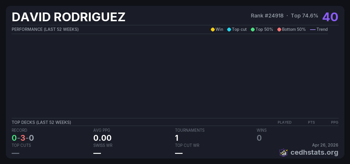 | CEDHH Aug 28, 2025 · 20 players | Invalid pairing | 13/20 | 0-3-0 | 0.00 | 40 |