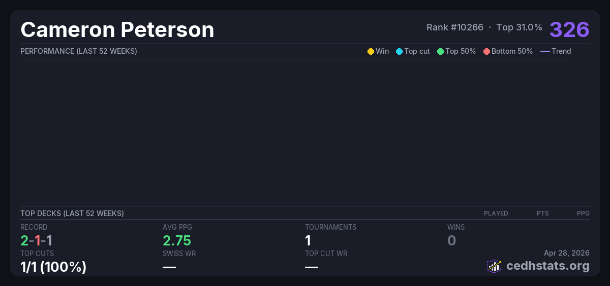 | End of the year store championship Dec 13, 2025 | 2/19 | 2-1-1 | 326 | |