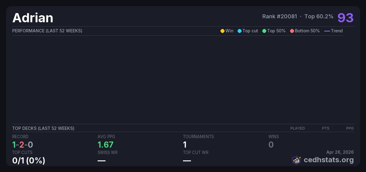 | August Invitational Qualifier Aug 30, 2025 · 18 players | — | 8/18 | 1-2-0 | 1.67 | 93 |