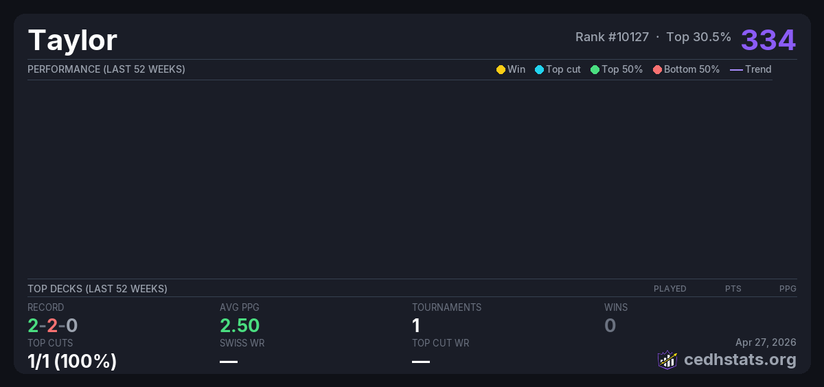 | Weekly Monday cEDH Jul 14, 2025 · 18 players | Invalid pairing | 2/18 | 2-2-0 | 2.50 | 334 |