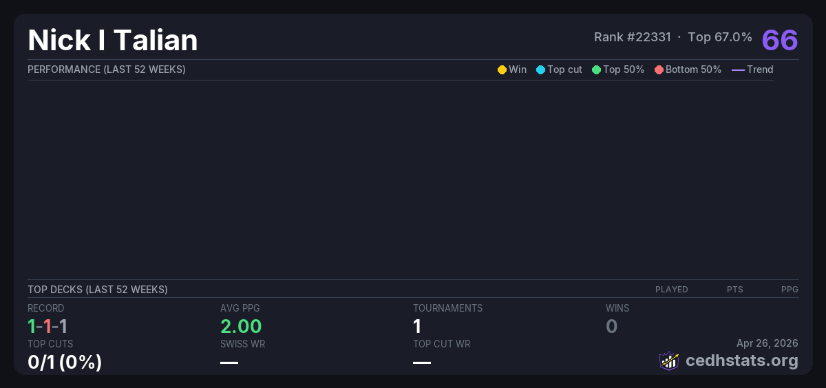 | Thirsty Thursday Oct 09, 2025 · 20 players | — | 10/20 | 1-1-1 | 2.00 | 66 |