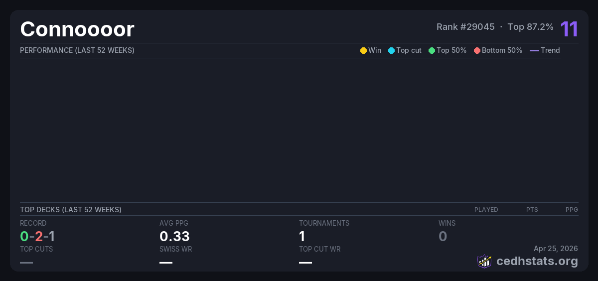 | Commander Precon League 2 Week 4 Sep 06, 2025 | Invalid pairing | 21/25 | 0-2-1 | 11 |