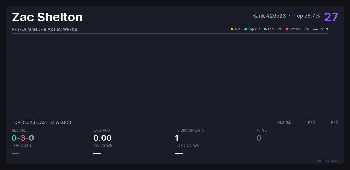 | Bracket 3 Mar 29, 2026 · 22 players | 17/22 | 0-3-0 | 0.00 | 27 |